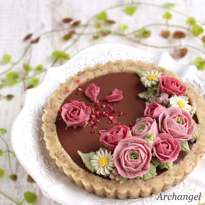 あんクリームでお花を口金で絞り、Rawケーキにデコレーションします。